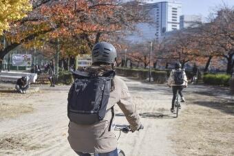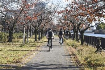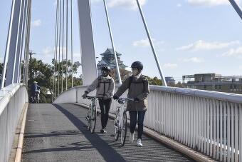 川沿いを進み、次に向かうのは毛馬桜ノ宮公園。 途中、ちょっとした観光スポットにもなっている、天満と都島区網島町を繋ぐ大川に架かった自転車・歩行者専用斜張橋を歩いて渡ります。 この橋からは、大阪城が望めるんです。 そのままサクラの木が並んだ川路を北上し、桜ノ宮方面へ向かってゆるりと走行していきます。