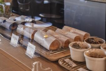 店内に入るとすぐ目に入るのは、居心地の良さそうな空間と、アクリル越しに並んだ美味しそうな揚げパンやお惣菜、そして川沿いが見渡せる大きなガラス張りの窓。 心地よいBGMで、のんびりとトークタイムを過ごしたくなりましたが、こちらでは、シナモンシュガーとチョコレートの揚げパンを買って次なる目的地を目指します。