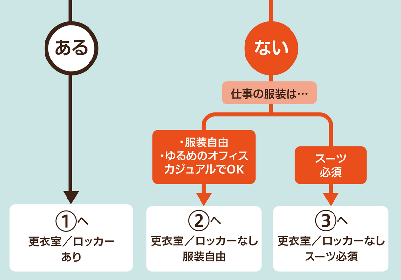 まずは着替えができるかどうか、さらに仕事着の自由度からベースとなる服装をチェックしてみましょう。