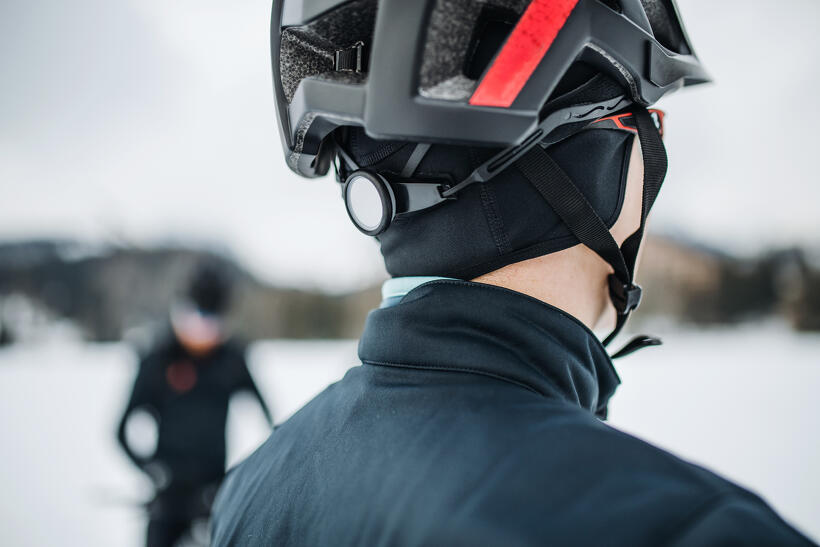 特に冷たさを感じるのは、やはり肌が露出している部分。首からあご・口元までカバーできれば意外と顔周りは暖かく感じられます。本格的に寒くなってきたら、ネックウォーマーや、イヤーマフ、フェイスマスクなどで暖めましょう。イヤーマフはヘルメットの上から装着するので、後頭部の下から支えるタイプが◎。