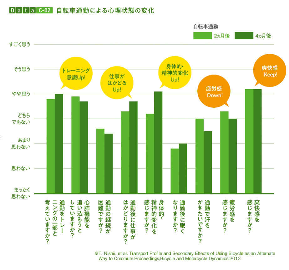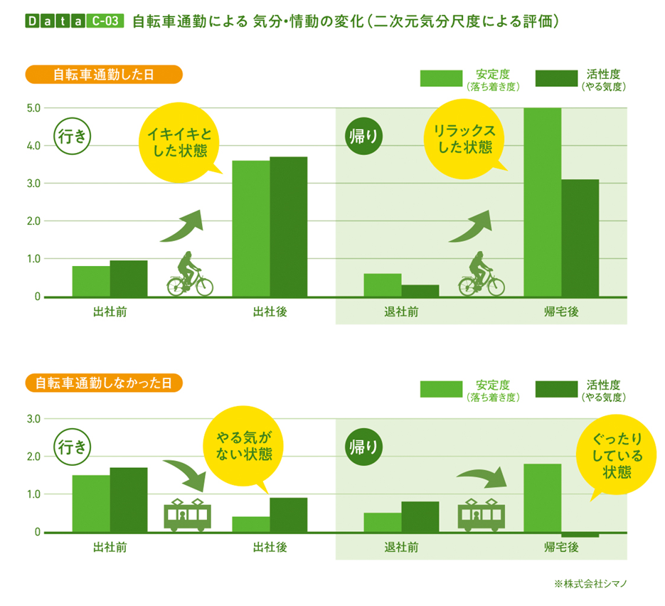 仕事を始める前は前向きな気持ちに、帰宅後は落ち着いた心境になっていることは、自転車に乗ることによって、気持ちの切り替えがスムーズにできていることの表れであり、雨天や仕事の都合によって自転車通勤できなかった日の数値と比較すると、違いは明らかです。