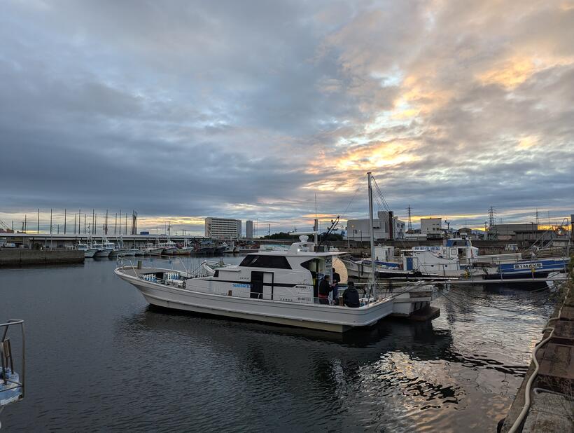 午前6時前、忠岡港に集合した参加者の皆さん。今回はシマノの製品テストやロケでもお世話になっている「Osaka Bay Fishing Guide K’s」さんの船に乗りました。