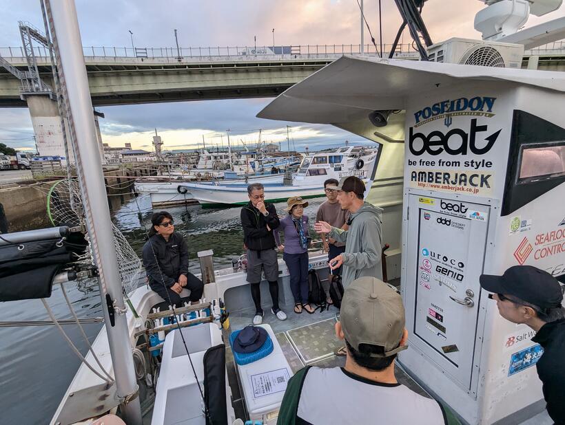 出船前に、KAGE店長による安全講習を実施。ライフジャケットの着用方法や釣り針の扱い、根掛かり時の注意(糸を素手で触らない!)、リール操作の基本など、初めての船釣り(オフショア)に臨む際の心構えをお伝えしました。