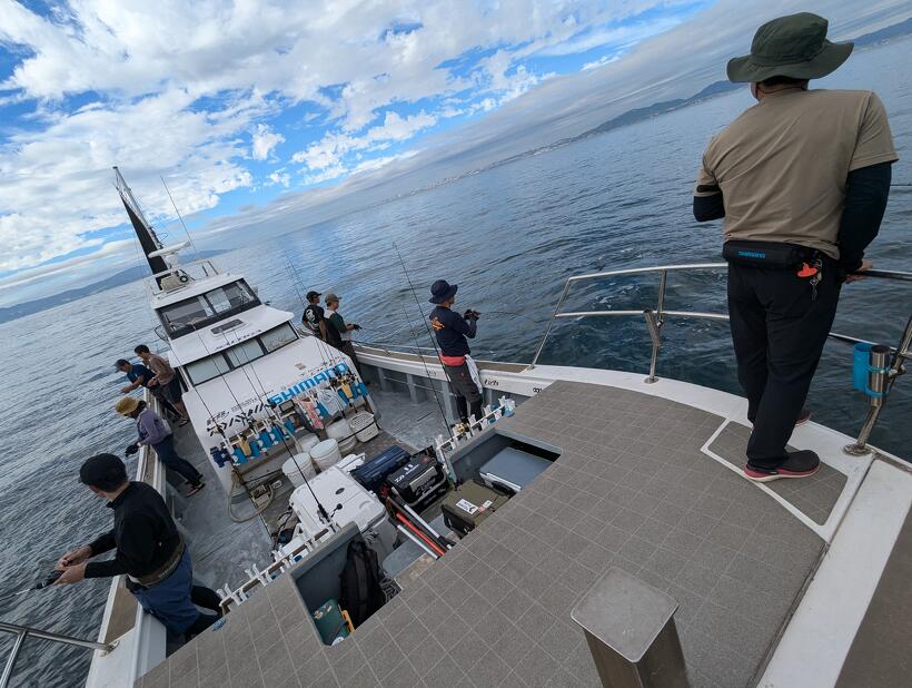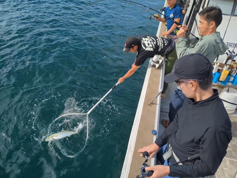 さらに別のお客さんもヒット!「慎重に!巻いて巻いて!」青物はよく走る(針を外そうとしてよく泳ぐ)ため、近くの人がヒットしたら素早く仕掛けを回収してオマツリ(糸同士が絡まること)を避けます。