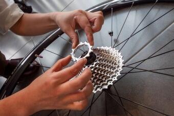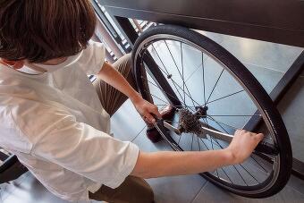 まず自転車の後輪を車体から取り外します。このとき、リアのシフトレバーを操作して、一番小さいギアにチェーンを移動しておくとスムーズに取り外せます。 ブレーキにタイヤなどが引っかかって外れにくいときは、ブレーキの調整機構を操作する、あるいはタイヤの空気を抜くと外しやすくなります。