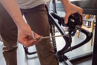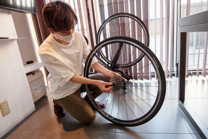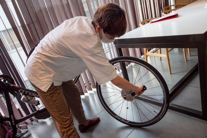 「んー。これで有馬街道を走るのはキビシイかも」と画像を拡大してチェック。私が気になったのはギアの仕様で、YUKIさんの自転車には登り坂を軽くこげるギアが足りていませんでした。急な上り勾配が続く山道を走るには女性の脚力ではキツイかもしれません。「これ、34T(T=歯の数)に変えましょう」と提案し、My工具を使ってパーツ交換をすることにしました。
