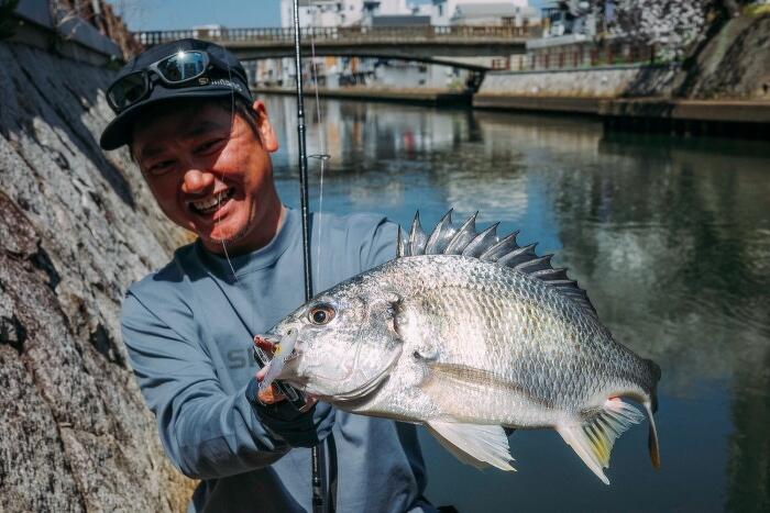 振り向くと前田さんのロッドがいい曲がり! 落ち着いたファイトで暴れる魚をいなすと、水面に顔を見せたのはいい型のチヌでした。無事にランディングに成功すると、前田さんも安堵の笑顔を浮かべました。