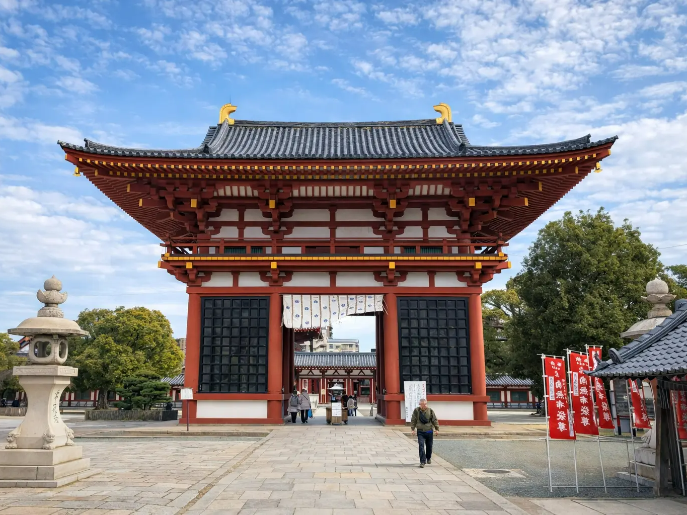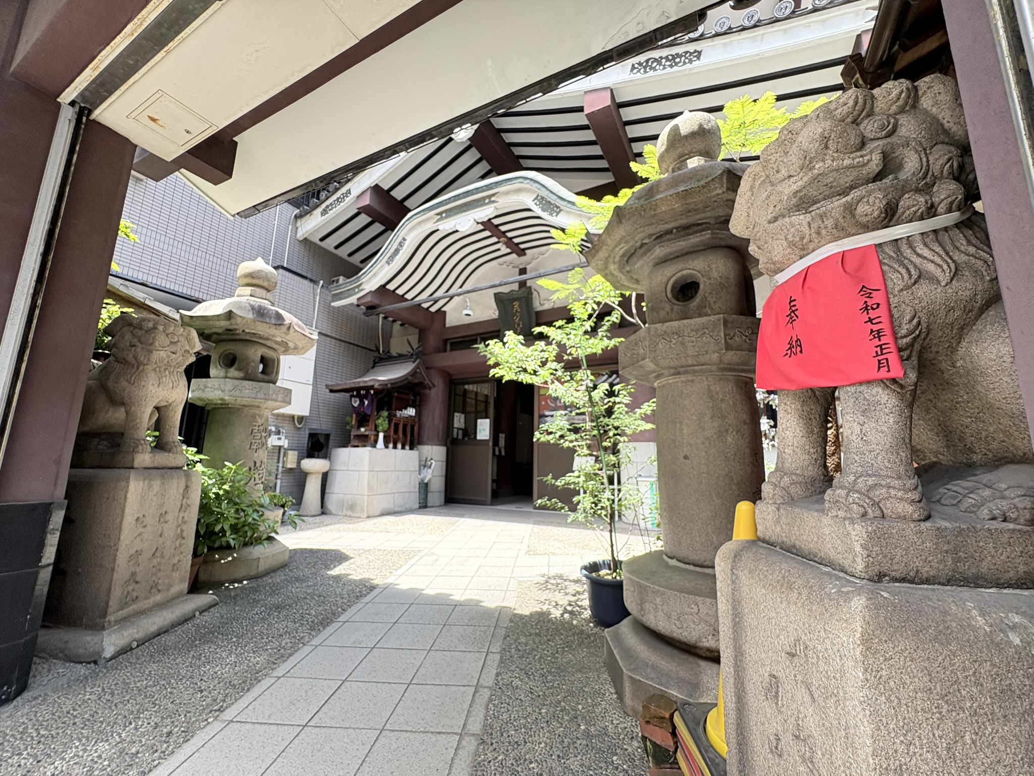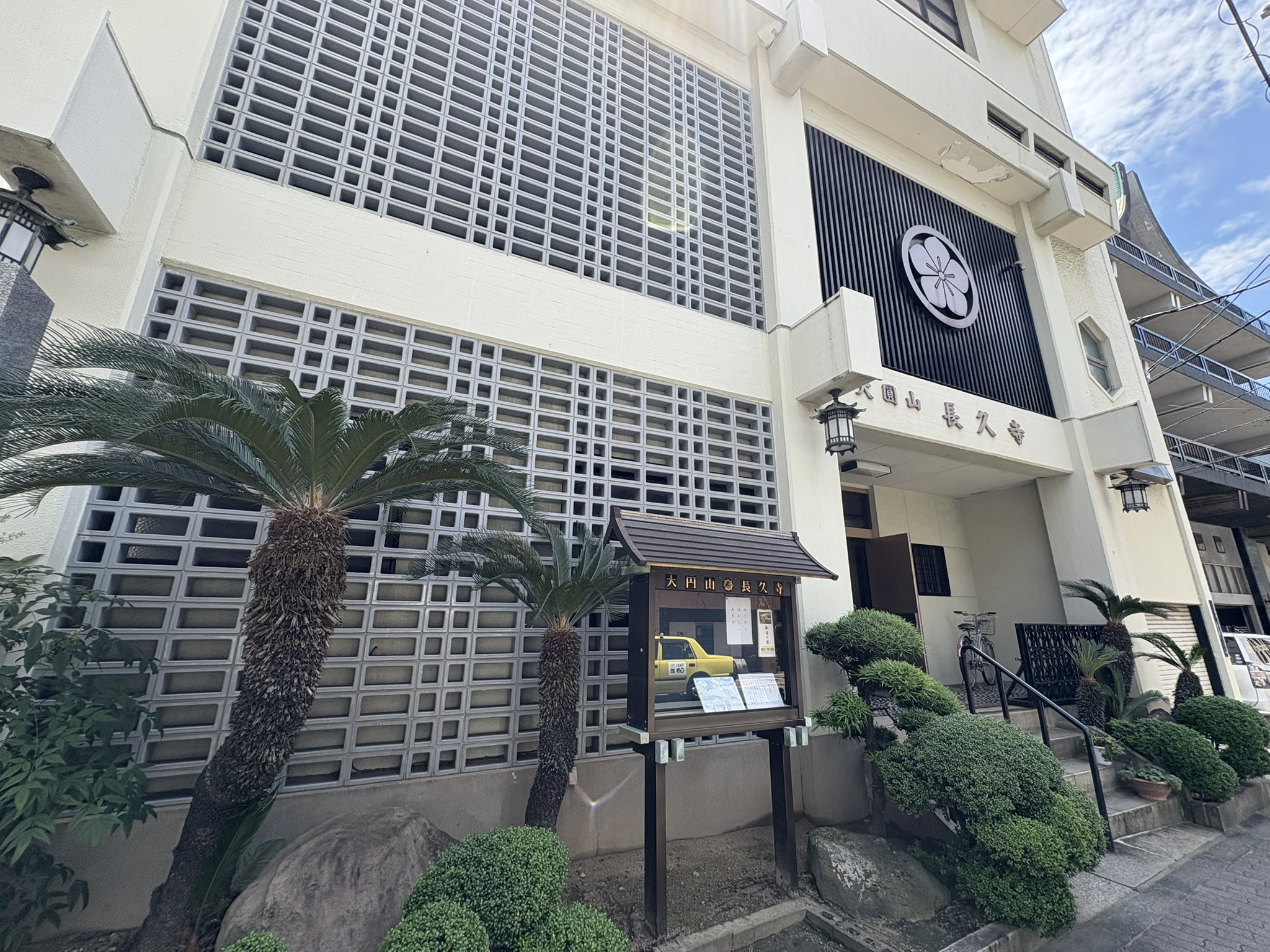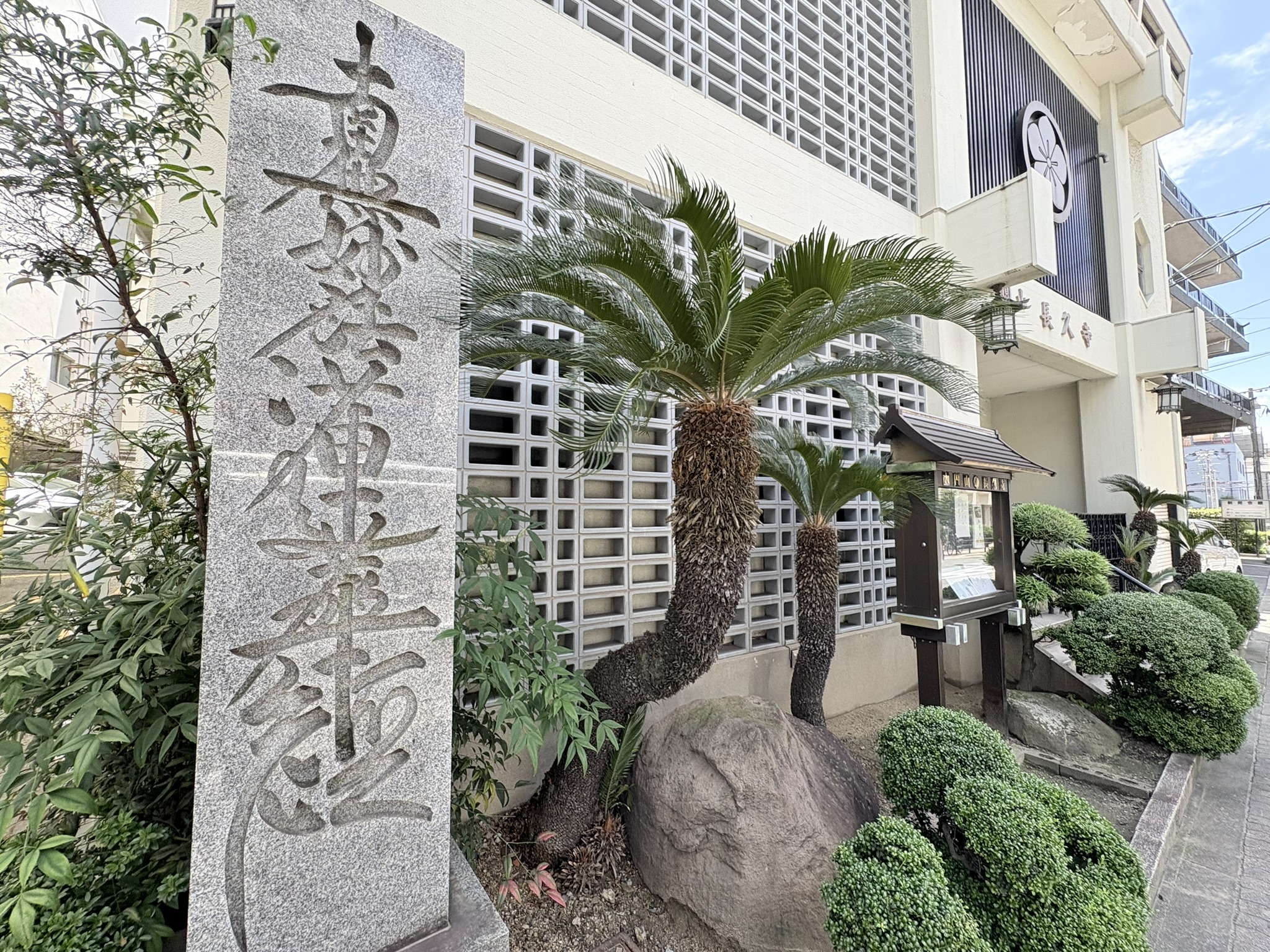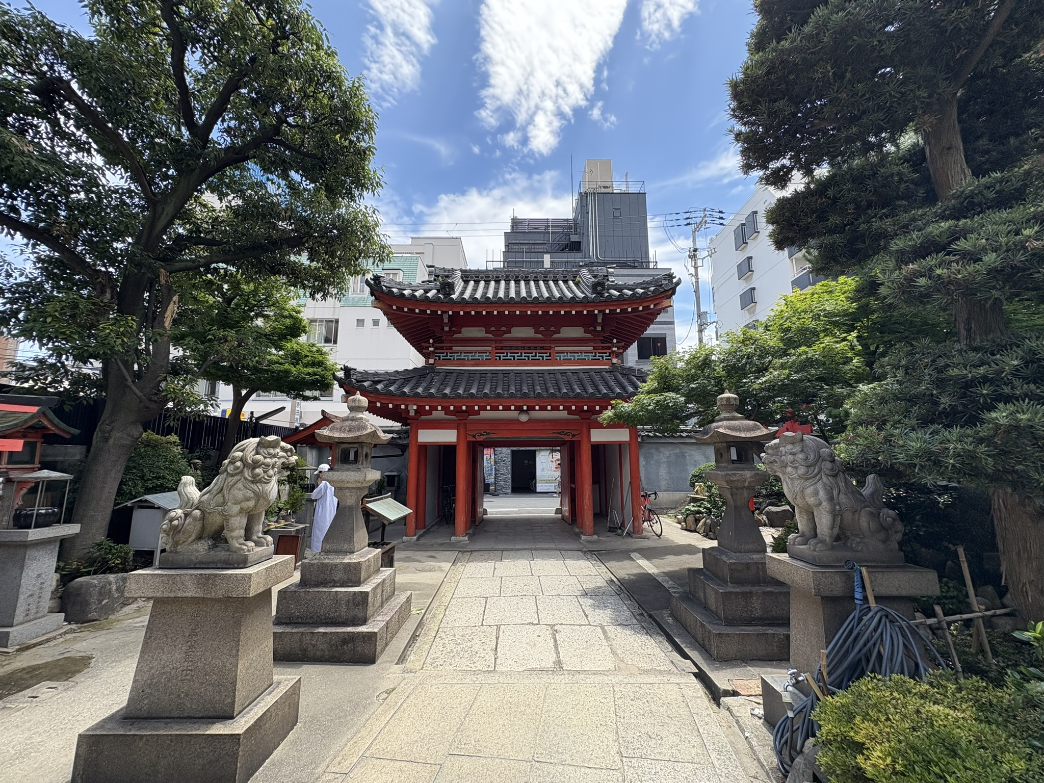 上町大地へと続く緩やかな坂を上った先に、現代的な雰囲気のお寺がある。入口両脇に植えられた蘇鉄が、お寺らしい特徴を感じさせる。大阪城築城の建材が本殿に利用された話や、秀吉と淀気味の子・秀頼の武運長久を祈った逸話も残されている。祀られている福禄寿は玄関のすぐ脇で出会える。