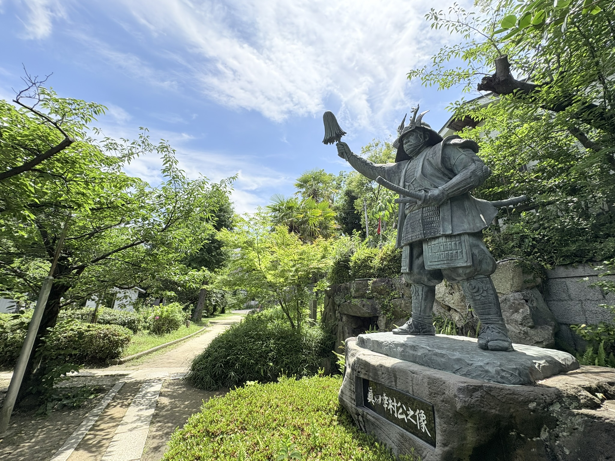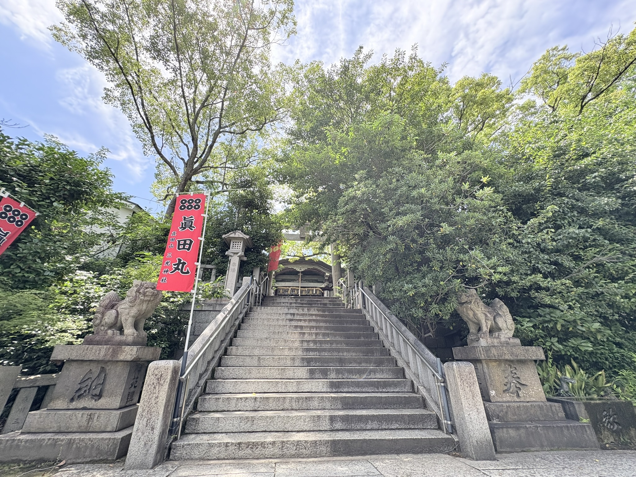 大通りを越え、地元で「宰相山」、「真田山」と呼ばれる鳥居の先の階段を上りきると、本殿の隣で長寿を司る「寿老人」が出迎えてくれます。大阪の陣では「真田丸」が置かれ、大阪城へとつながる抜け穴の伝説が、今も目に見える形で神社の麓に残っています。 -