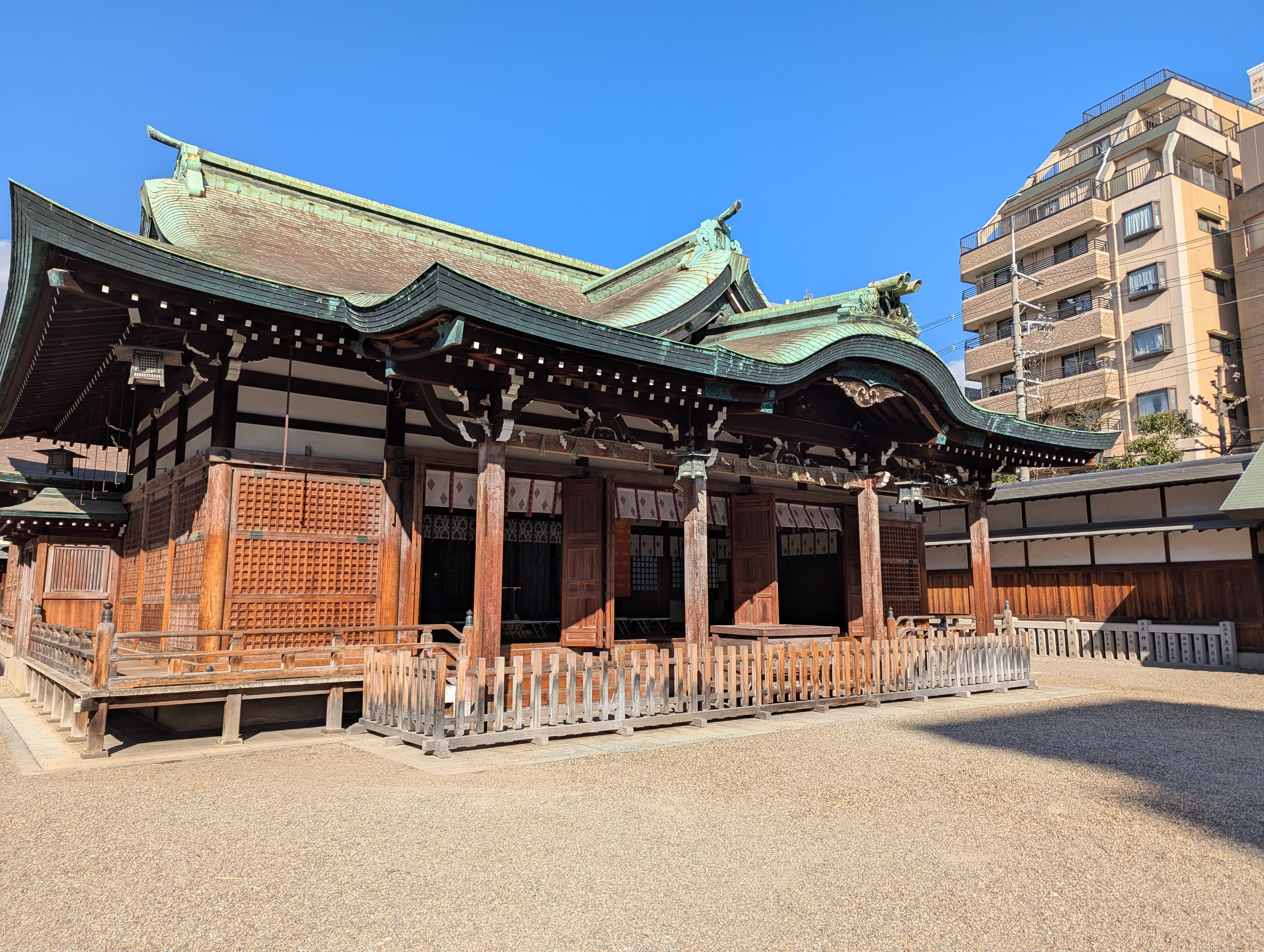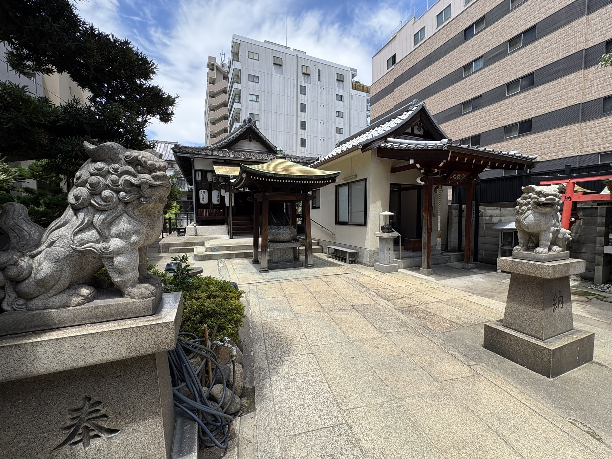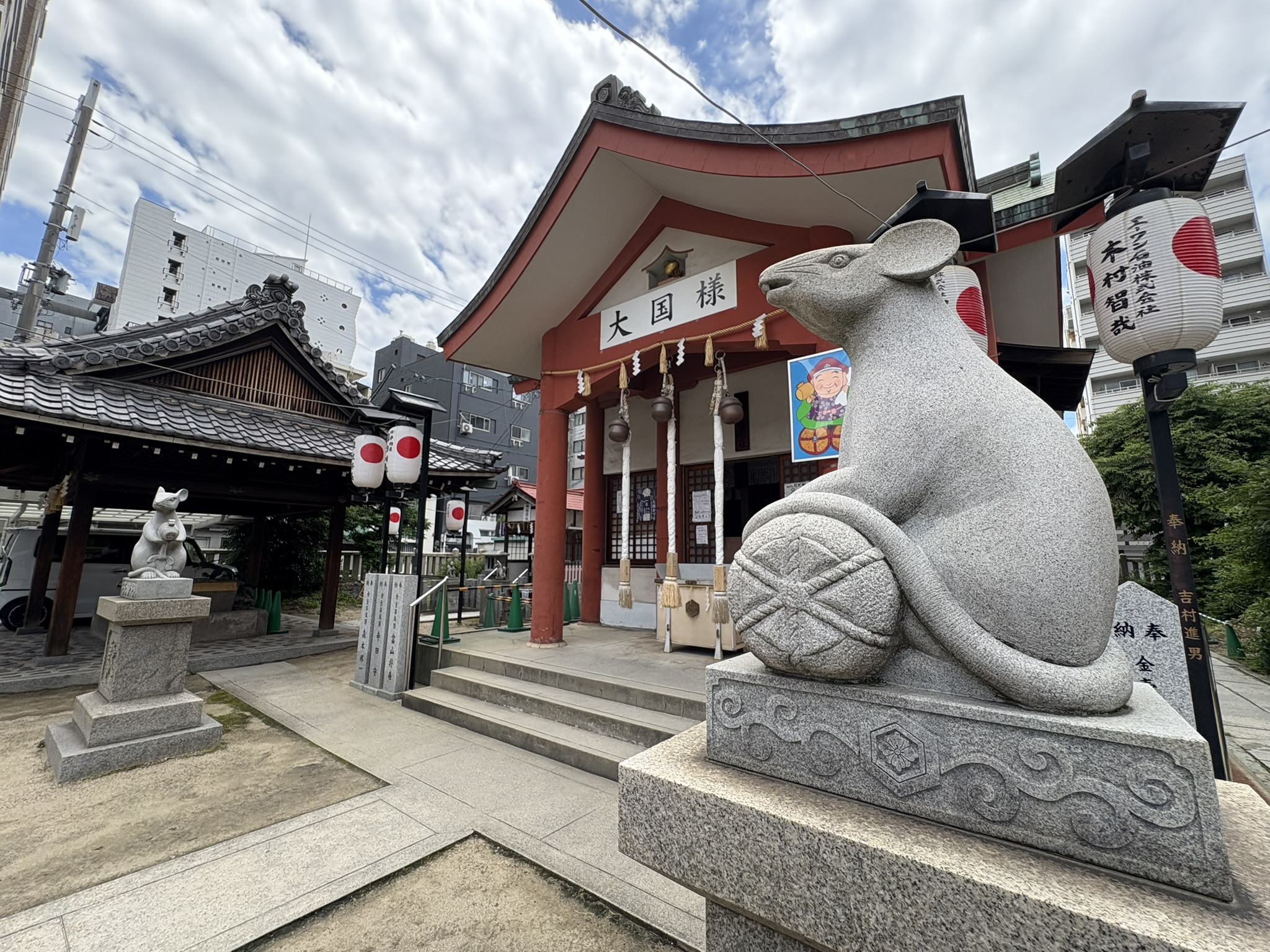 車の往来が激しい国道26号線を渡ると、高い塀と生垣に囲まれたお社が現れます。かわいらしい狛犬ならぬ「狛鼠」が大黒天の目印です。浪速の地の発展に尽くした木津勘助の像が、豊穣を祈る姿を後ろから見守ってくれるでしょう。 -