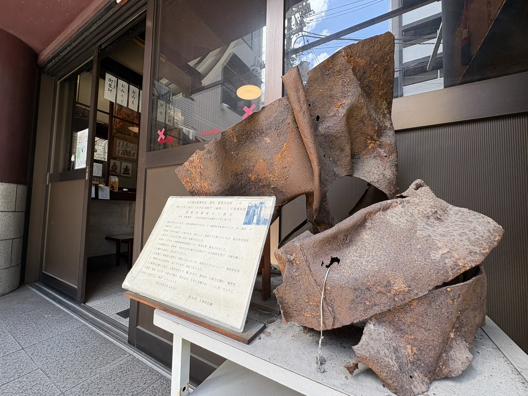 「でんでんタウン」の賑わいを曲がった先に、毘沙門天を祀る大乗坊があります。幾多の戦火を乗り越えた本尊と毘沙門天を象徴するかのように、本殿脇にはB-29が戦中に投下しさく裂した1トン爆弾の残骸が置かれています。 -