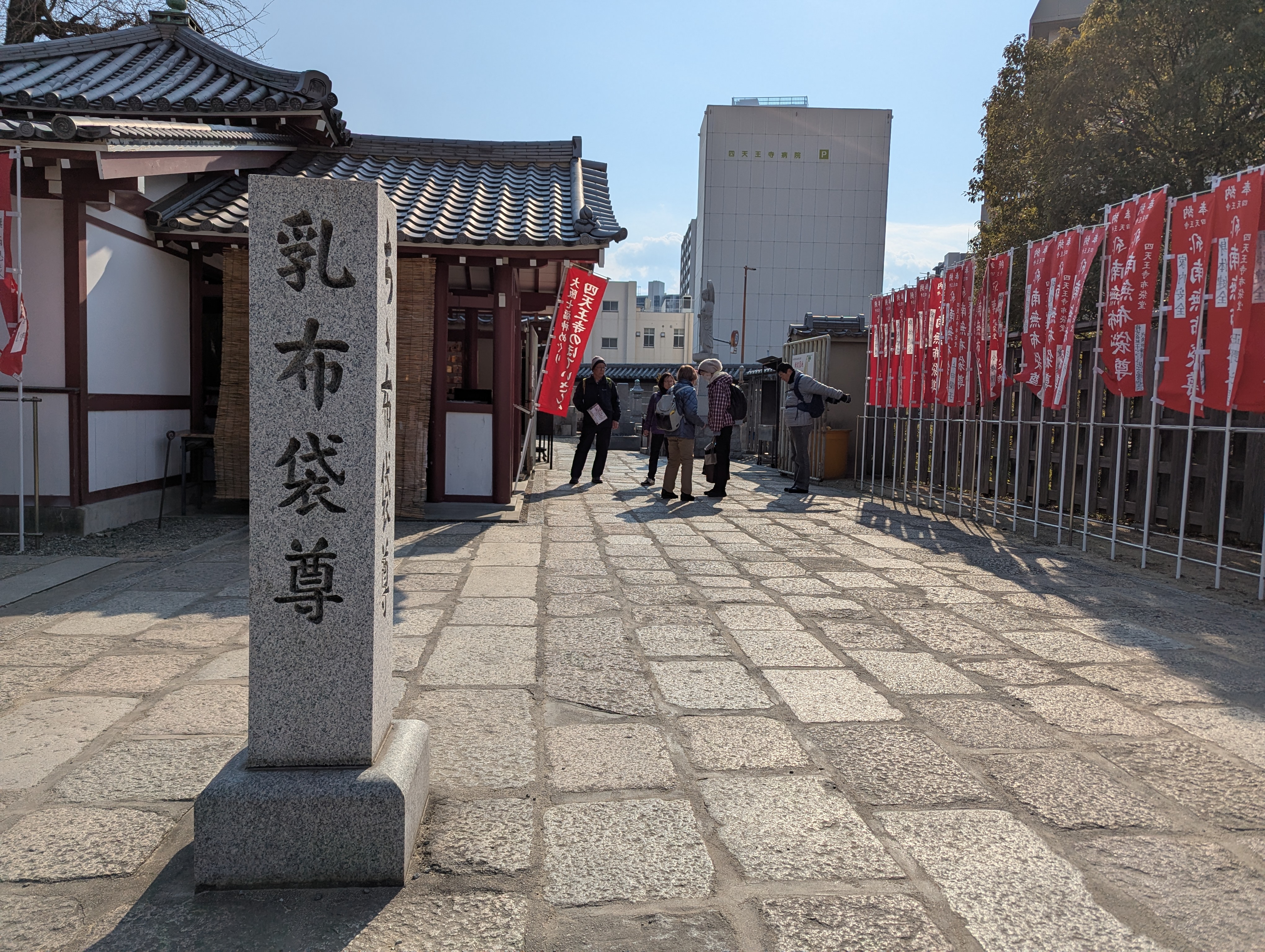 大阪在住ならば、きっと一度は訪れたことがある四天王寺。重厚な建物の西のお堂に、「乳布袋」と呼ばれ、産後の母が良く訪れるという白い布袋尊がたたずんでいます。境内の建物は歴史の重みを漂わせており、ご利益の願いが確信へと変わるかもしれません。 -