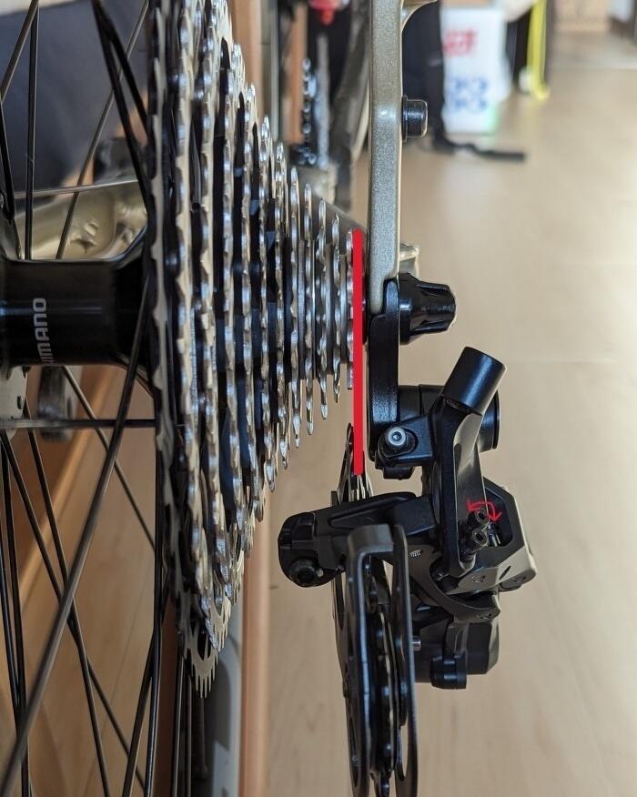 ワイヤーが接続できたら変速調整です。エンドアジャストボルトをまわし、ギアとディレイラーのガイドプーリーを適切な距離にします。プレートの▲51T刻印とギアの高さを揃えます。