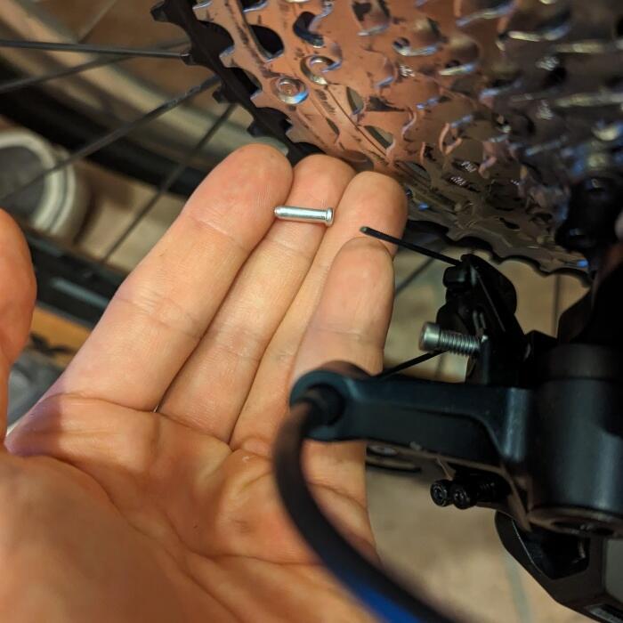 シフトワイヤーをアウターケーブルの中に通してゆき、出てきた端をリアディレイラーに固定します。