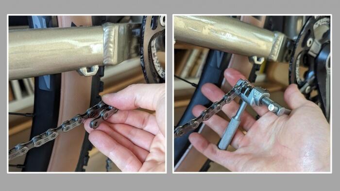 チェーンを適切な長さにカットします。チェーンを一番大きいギアとチェーンリングにかけ、ピンと張った状態から1~3リンクを加えた長さでカットします。