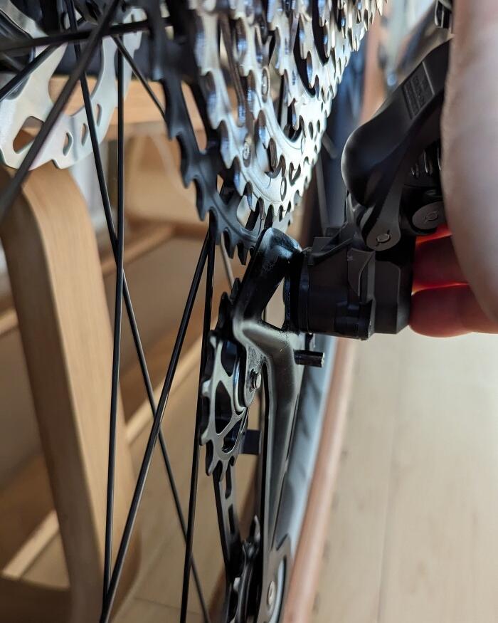 次に、ディレイラーのプーリーが一番大きいギアの真下にくるように、ロー調節ボルトを回します。ここの位置をしっかり合わせないと、チェーンが一番軽いギアまで移動しなかったり、チェーンが一番軽いギアを通り越してスポークとスプロケットのすき間に落ちてしまったりします。