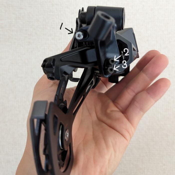 まず、真後ろから見てディレイラーのプーリーが一番小さいギアと揃うようにトップ調節ボルトを回します。