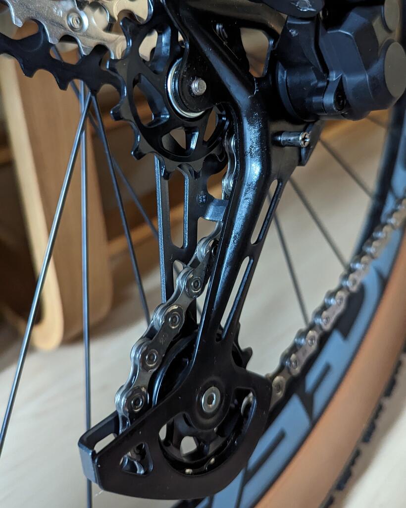続いてチェーンを取り付けます。12速のコンポーネントには12速専用のチェーンを使う必要があります。11速以下のチェーンよりも幅が狭くなっており、12速スプロケットの狭いギア間隔に対応でるようになっています。
