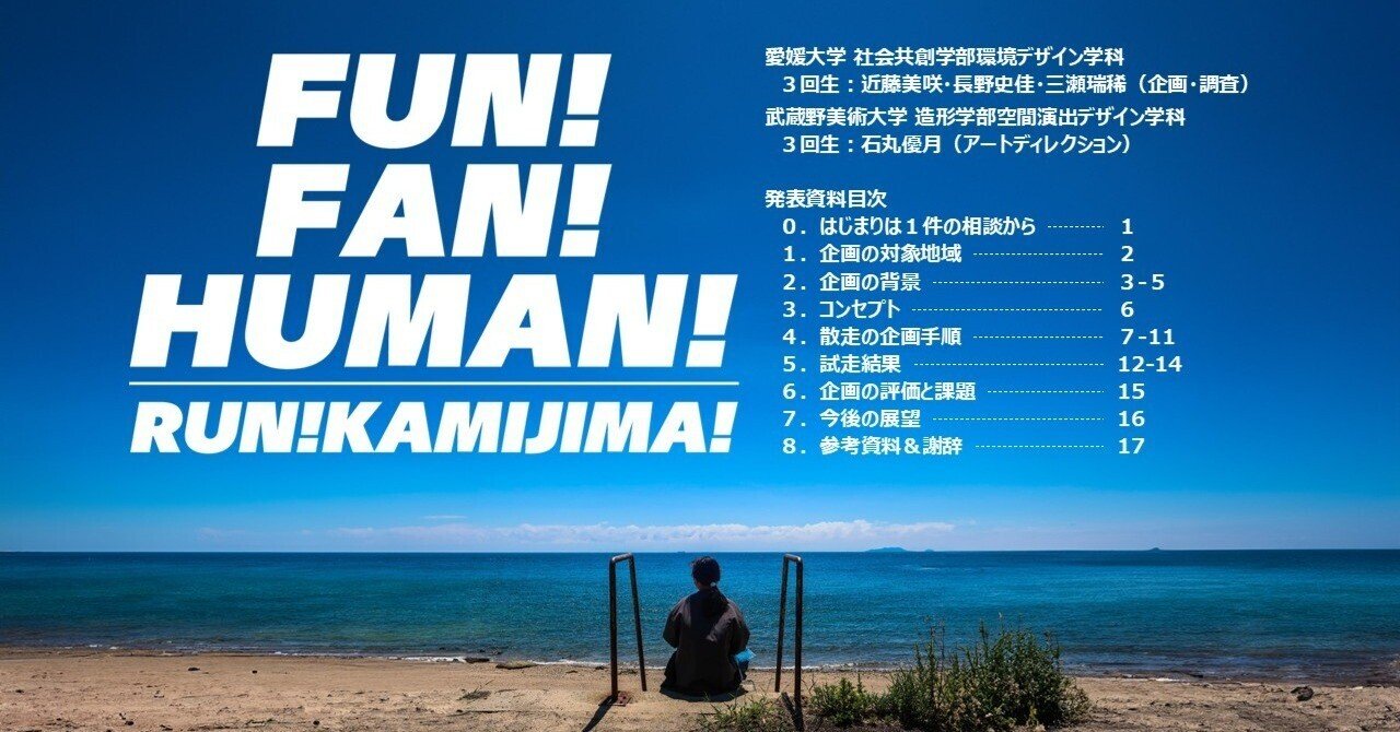 2024年の第7回コンテストで大賞を受賞したのは、愛媛大学 社会共創学部 環境デザイン学科と武蔵野美術大学造形学部空間演出デザイン学科による「FUN!FAN!HUMAN!RUN!KAMIJIMA!」。