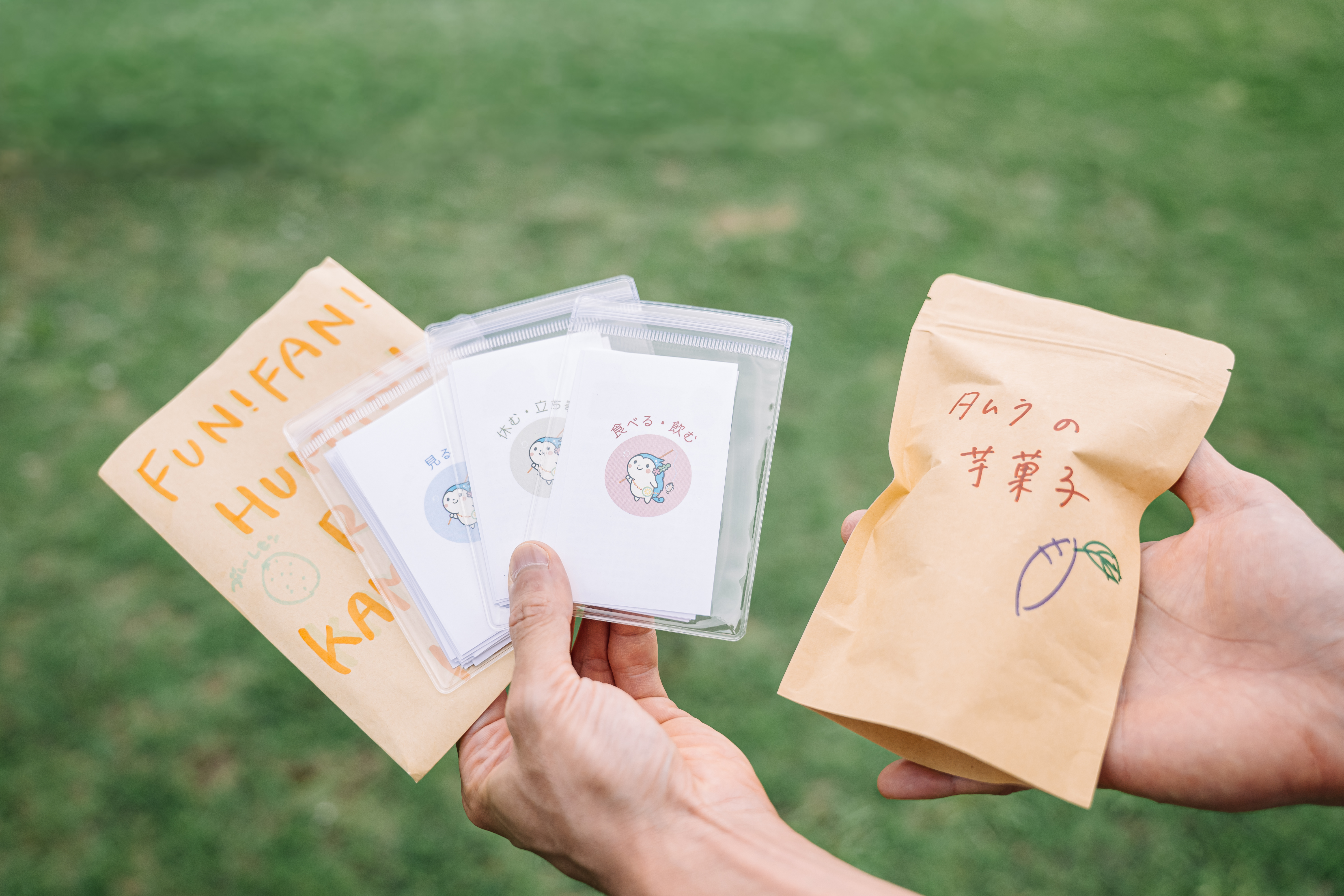 9月28日午前11:00。弓削島の弓削島ひだまり公園に集まった参加者がイベントに使用するマップとカード、さらに導入のおやつ収めたサコッシュを受け取ったところで、説明開始。イベントの注意事項や楽しみ方を説明したうえで、3〜4名ほどのチームを組んで散走を開始します。散走の始まりは、もちろん行き先を決めるカードを引くところから。