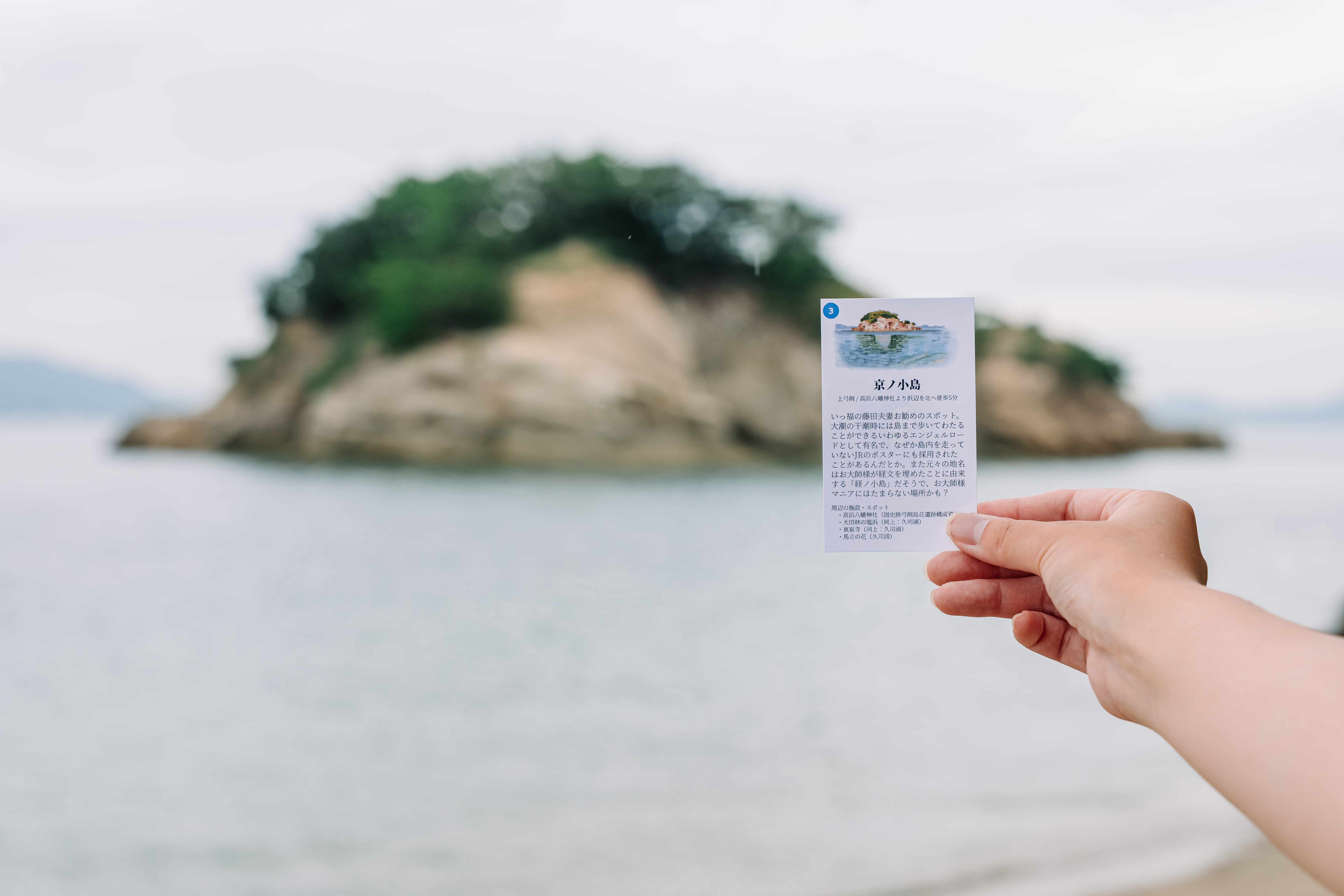 企画を立案に携わった近藤さん、学生グループが引いた最初のカードは、上弓削の「京ノ小島」。開催場所と同じ弓削島内のスポットのため、沿岸の道をゆったりと散走しながら向かいます。時おり立ち止まり、道を確認しつつ10分ほどで浜辺にぽっかりと浮かぶ京の島に到着!キットのカードには、スポットをおすすめした島の移住者さんの情報や島の由来などの情報が満載なので、景色を見ながらの仲間同士の会話も弾みます。