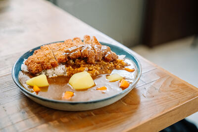 出発したのはいいものの、スマートフォンのマップなどを使わず、簡素な地図だけで初めてのスポットを見つけるのは大変。小さな路地を行ったり来たりするうちに、地図に記載されている飲食店「TORATTRIA アル」を発見。お昼も近いので、急遽目的地を変更してここで看板メニューのカレーをいただくことに。