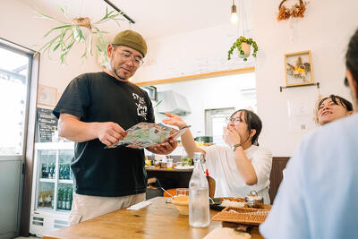 参加者を「おかえり!」と迎えてくれる厨房の前川さん「学生さんたちは、何度も島を訪れて企画を作ってくれたので、つい”おかえり”と声をかけたくなるんですよね。普段、サイクリストは路地の奥まで入ってきてくれませんし、島の中もそこまで変化があるわけでもないですから、この散走企画でたくさんの方に、島の楽しさを発見してもらえるようになるといいですね」と語ります。すっかり打ち解けて話す、学生さんと前川さん。そこには、観光客と地元民を隔てる”よそ者感”のない、暖かなふれあいがありました。