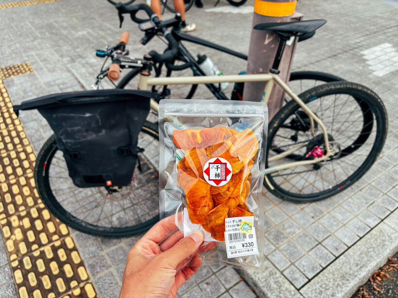 コースもほとんど登りのない快走路で、穏やかにペダルを回しながらも、休憩も兼ねて途中の道の駅をチェック。エコバッグやリュック、あるいはバイクにパニアバッグを装着してきた準備のよい参加者の方は、ここで果物を購入していた。かくいう私も、かさばらない干し柿をゲット。