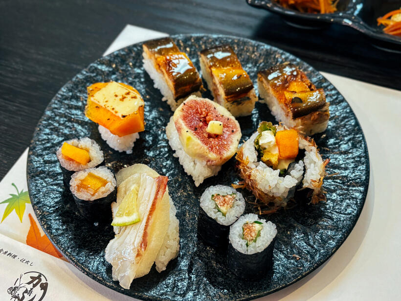そして恐る恐る一口食べてみると……美味しい! 個人的には柿とチーズのお寿司がヒットでした。
