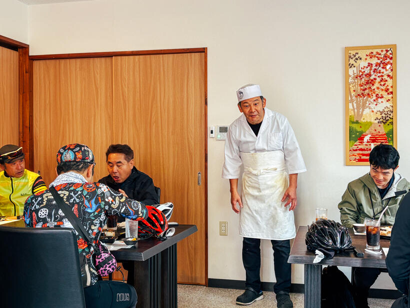 店主の力谷昭夫さんは、フルーツの町として知られる紀の川市にお寿司で貢献できないかとこのフルーツ寿司を試作したのだという。初めはうまくいくか自分自身も不安だったそうだけれど、今では地域の名物として知られるようになった。「おかげさまでフルーツ寿司を始めてもう10年になります。ぜひこの町を楽しんでいってください」と集まったサイクリストへのメッセージも。