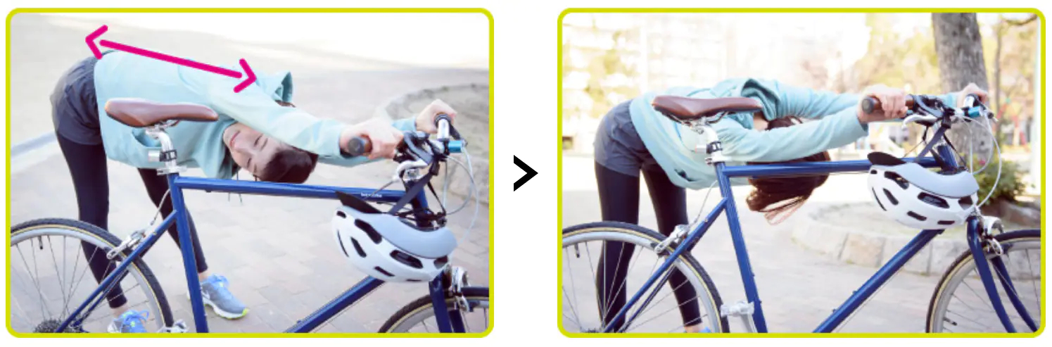 足を腰の幅に開き、両手でハンドルを持ったまま、背中を倒しましょう。顔を左右それぞれに向けて1回各20秒キープ。顔を向けている方の脇と背中の伸びを意識しましょう。