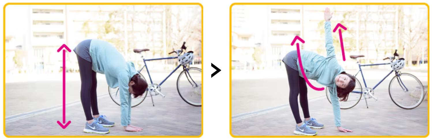 お尻の伸びを感じながら前屈して両手を床に着け(無理な場合は浮かせてもOK)、胸の前を伸ばす感覚で片手を上に8秒キープ。これを左右3セット行います。