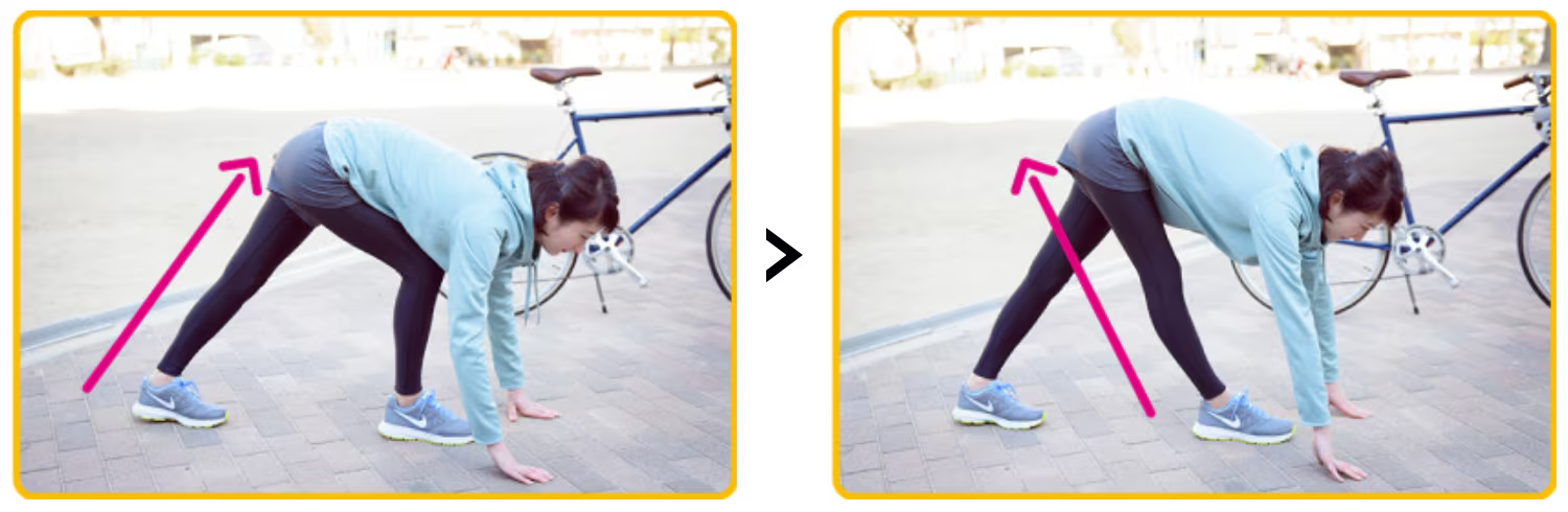 両手を床に着いて、片足をアキレス腱の伸びを感じる程度に後ろに引きます。前後の足の加重を1・2、1・2のテンポで交互に10回スライドさせ、お尻と両足の後ろ側の筋肉を伸ばします。