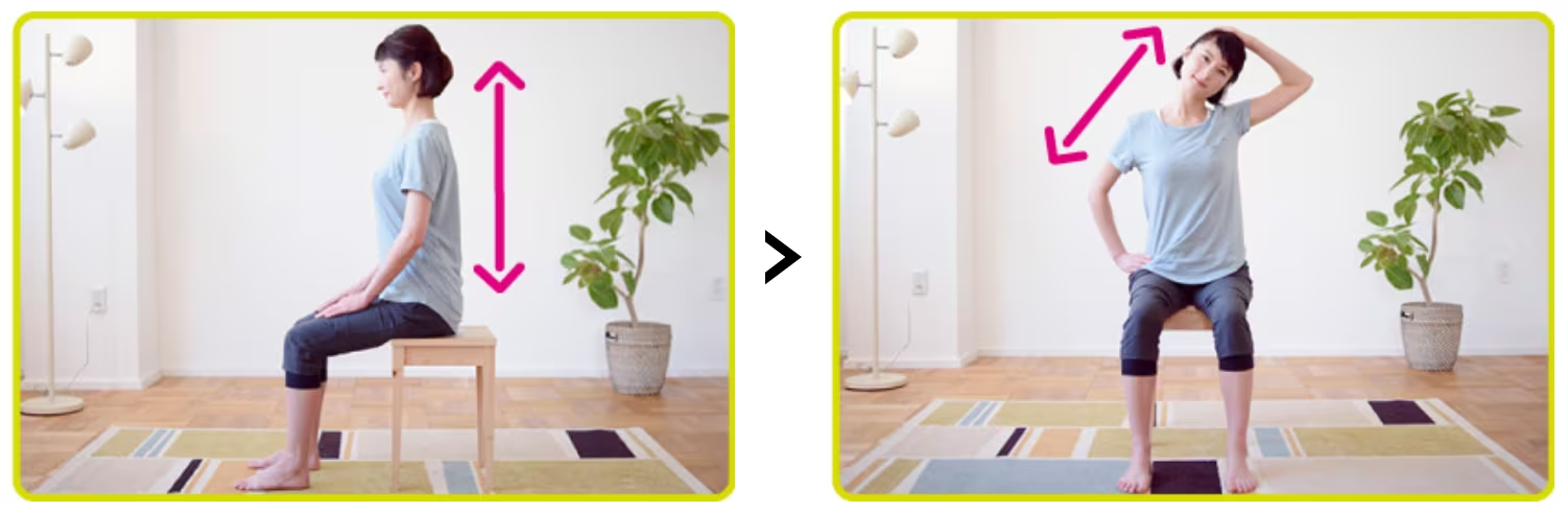 猫背にならないように座骨を立てて椅子に座ります。手を頭で引きながら真横に倒して、20秒キープ。これを左右交互に行いましょう。