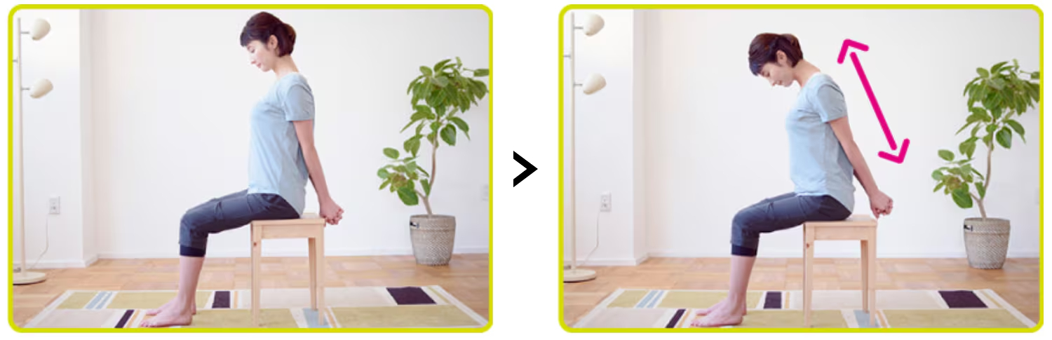椅子に座って後ろで手をつなぎ、肩甲骨を中央に寄せながらアゴを引いて腕を下に伸ばします。グッと腕を伸ばした状態で20秒キープ。首の後ろの伸びを意識しましょう。