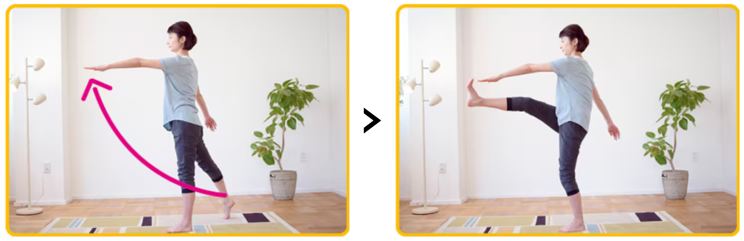片手を前に水平に出し、その手と反対側の足を後ろに引き上げ、反動を活かしてスイングするように前へ蹴りだし、15回繰り返します。これを左右行います。股関節をほぐし、血流の改善につながります。