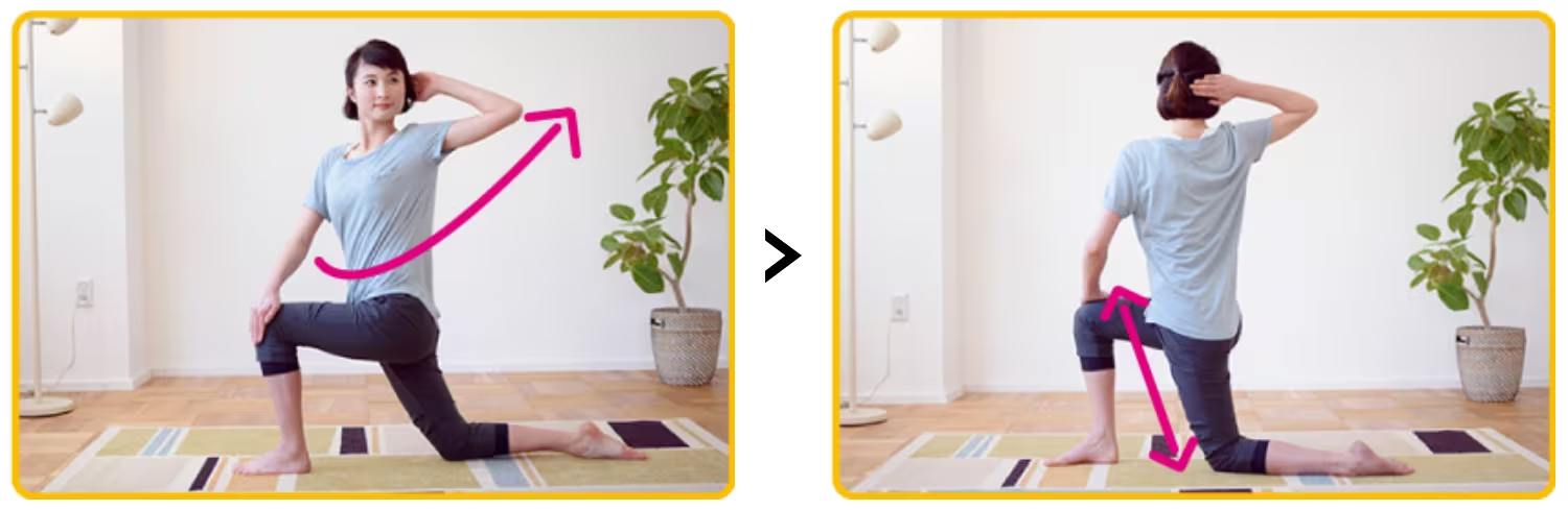 左足を立て、右足を伸ばして膝を付け、左手を頭に当てて上半身を左にグッとひねって20秒キープ。脇腹から肘をグッと伸ばして縮んだ筋肉を元に戻します。この動きを左右交互に行います。