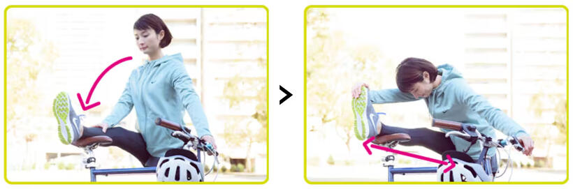 サドルに片足を乗せ、つま先を上げて前屈します。太ももの裏からアキレス腱がピンと伸びるように意識して20秒停止。これを左右行います。サドルに乗せることが難しい場合は、トップチューブ(自転車の上パイプ)に片足を乗せてもOK。