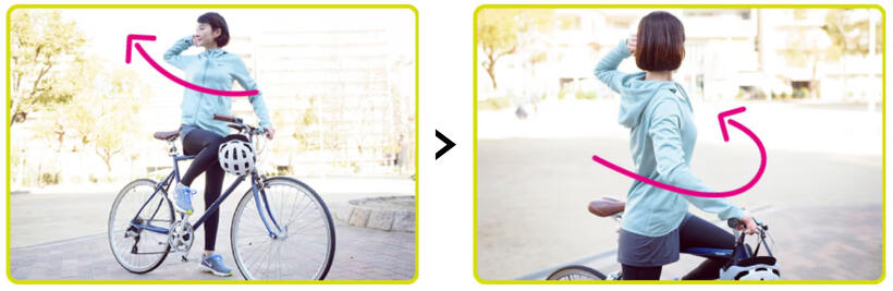 自転車をまたいで片足をペダルに乗せます。ペダルに乗せた足側の手を頭に添えて胸を開きます。胸の前が伸びる感覚を意識して、左右各20秒静止します。