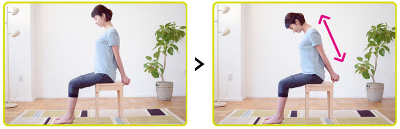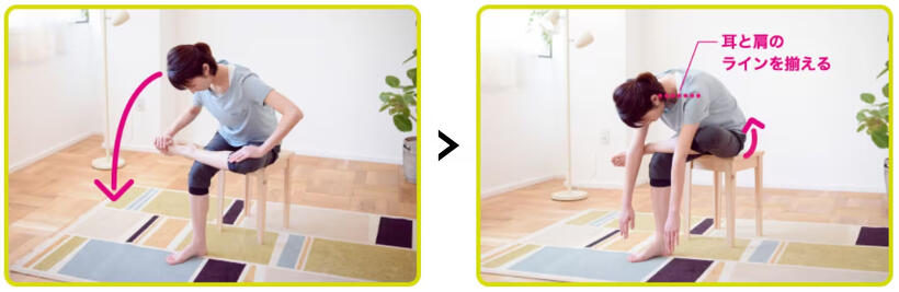 座骨を座面に着けることを意識して椅子に座り、片足を曲げて膝の上に乗せます。そのまま前屈して、肩の力を抜いて20秒停止。曲げている足のお尻の筋肉を伸ばしましょう。