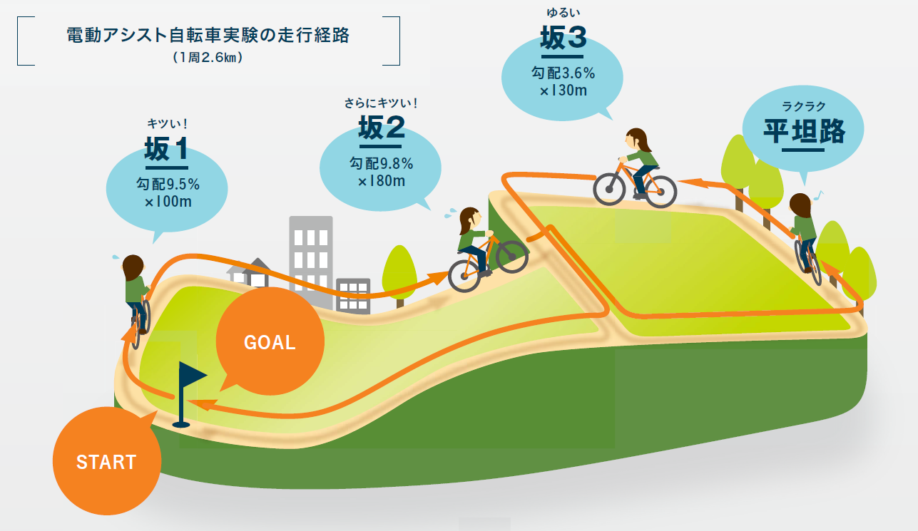 | 実験内容 | 3種類のアシストモードごとに、心拍数と筋活動を測定 (小休止をはさみながら、強モード・標準モード・オートエコモードでそれぞれ1周ずつ走行。走行中の心拍数および筋電図を計測) |
