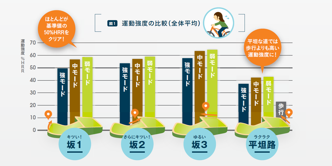 特に坂3(ゆるい)を走行した際の運動強度が全般的に高く、アシ ストモードを使用しても健康づくりを維持できる強度に達していることがわかりました。