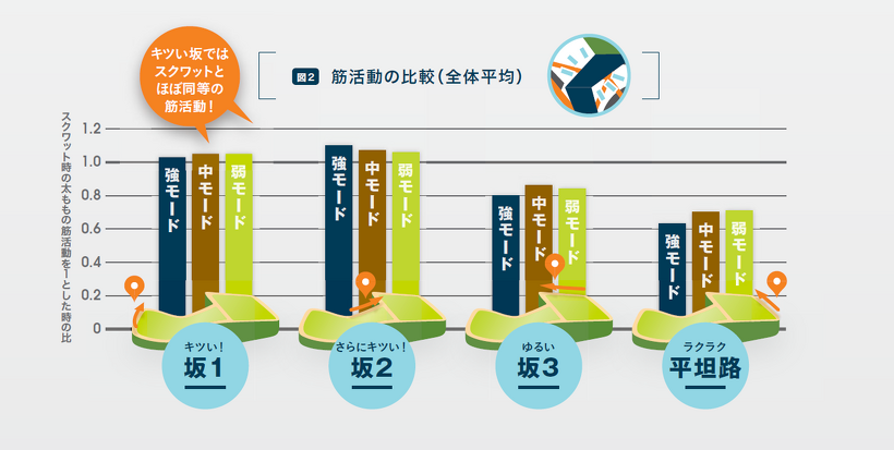 筋活動では、勾配のキツい坂の方が全体平均で筋活動が活発である結果に。この数値はスクワット時の太ももの筋活動を1.0とした場合の比較数値であり、坂1・2においてはどのアシストモードでもスクワット時とほぼ同等の筋活動が見られました。