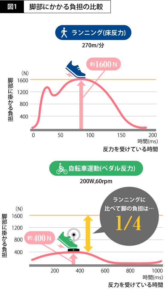 ジョギングやウォーキングでは、かかとやひざへの衝撃が大きくなる場合もありますが、 自転車はお尻をサドルで支えるなど、ガツンと来る衝撃が少ないので、足腰への衝撃を和らげることができます(図1)。