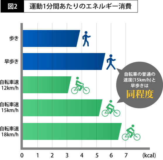 また、消費エネルギーも自転車なら普通に走る程度の速度(時速約15㎞)で、早歩きと同じくらいになるというデータもあります(図2)。