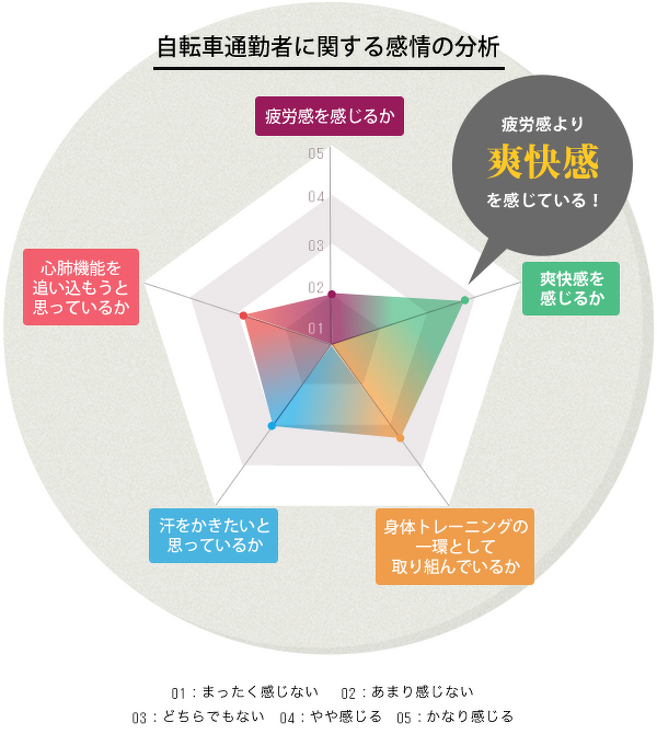 その結果、被験者は疲労感よりもむしろ爽快感を感じています。また、トレーニングの一環とは捉えておらず、気持ちよく通勤サイクリングを実施できていることが分かりました。これはスピード感や受ける風によって身体が冷やされることによって疲労感の軽減に繋がっている可能性があるようです。 気持ちよく実施できる通勤サイクリング、みなさんもぜひ体験してみてください!