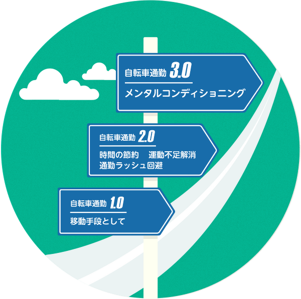 そして、今その利用価値は、「自転車通勤3.0」の時代へ。 自転車に乗ることで、メンタルコンディションを整え、 自分自身をイキイキとさせるための手段として 利用していくステージへ広がっていこうとしています。