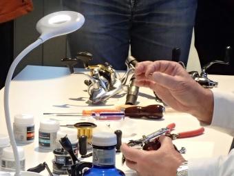 修理・アフターサービス部門のスタッフが講師となり、実際のリールを使って「グリスアップ」の体験ができる特別講座です。分解・組み立てのポイントや、日常メンテナンスのコツも丁寧に解説いたします。