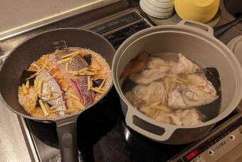 下処理した鯛を3枚におろし、アラで出汁を取ります。切り身は生姜と一緒にご飯に載せ、出汁でご飯を炊きました。素朴な味わいですが、鯛そのものの風味が堪能できる絶品ができました。