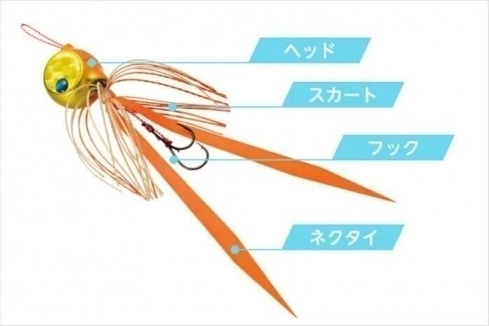 鯛ラバの仕掛けはシンプルです。「ヘッド」と呼ばれるタングステンなどの金属製のおもりの下に「フック」(針のこと)、そして「ネクタイ」と呼ばれるラバー製の飾りをセットします。